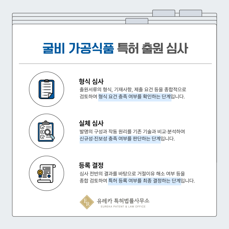 굴비, 보리 굴비, 고추장 굴비와 같은 식품 가공 기술을 특허로 출원하면 가장 먼저 형식심사가 진행됩니다.