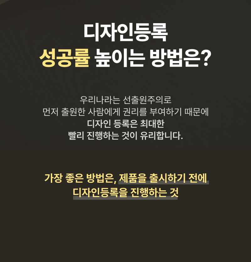 또한 등록 요건 중 하나인 '신규성'이 인정되어야만 등록이 가능하기 때문에 제일 좋은 방법은 제품 출시 전 미리 디자인등록을 진행하는 것입니다!