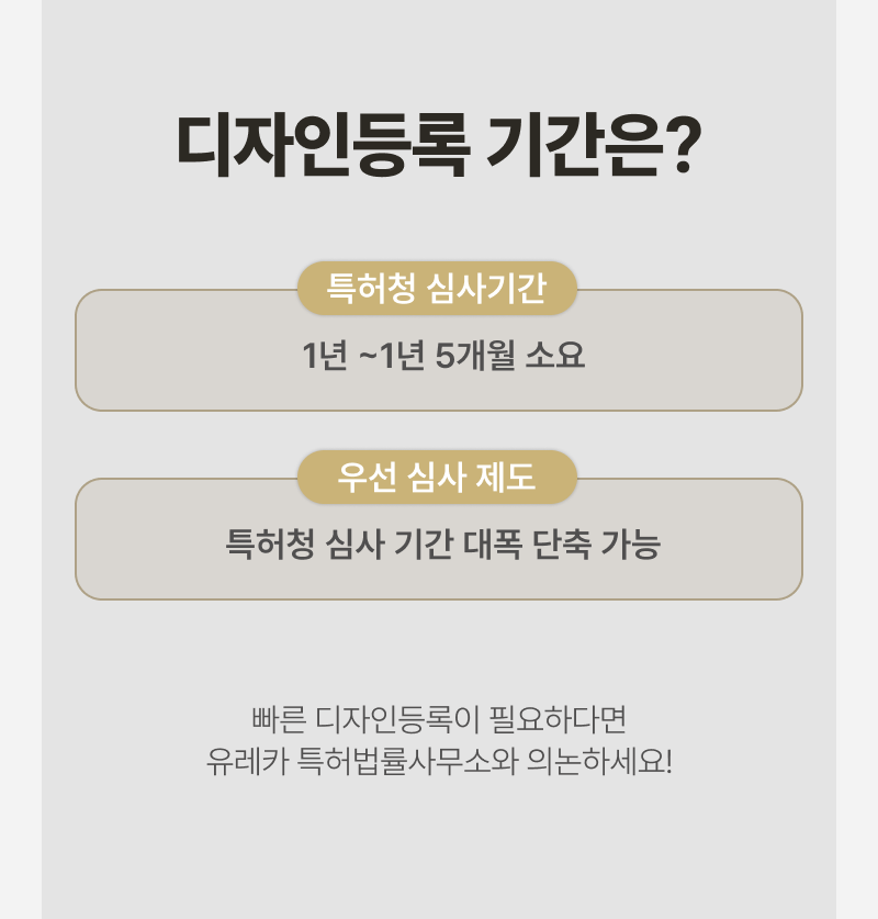 또한 우선 심사 제도를 이용할 경우, 1년 이상 걸리는 지식재산처(前 특허청) 심사 기간을 획기적으로 줄일 수 있기 때문에 빠른 디자인 등록이 필요하시다면 유레카와 의논해보셔도 좋겠습니다.