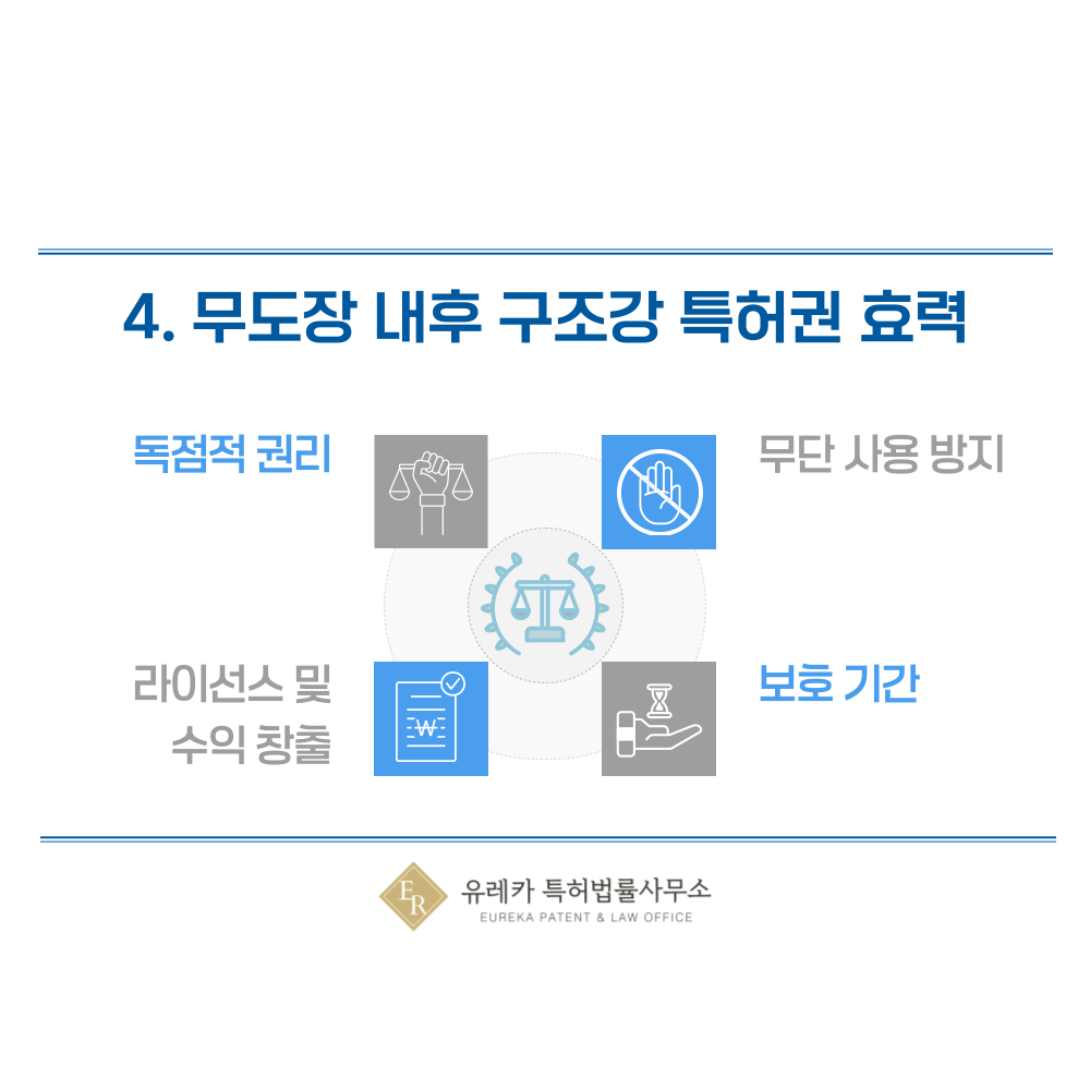 무도장 내후성 구조용 강재가 특허로 등록되면 발명자는 해당 기술을 독점적으로 활용할 권리를 갖게 됩니다. 즉, 무도장강의 합금 조성, 내후피막 형성 방식, 표면경화 기술과 같은 핵심 요소는 권리자의 허락 없이 다른 사람이 사용할 수 없습니다. 이를 통해 발명자는 시장에서 기술적 주도권을 확보하고 안정적인 위치를 지킬 수 있습니다.