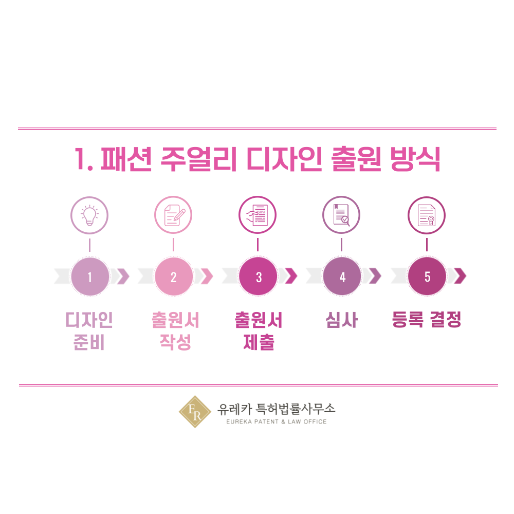 1. 패션 주얼리, 반지, 목걸이, 팔찌, 귀걸이, 펜던트, 체인, 커프 디자인 출원 방식