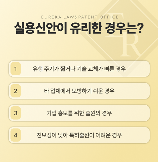 유행 주기가 짧은 분야의 발명의 경우에는 특허보다 실용신안으로 등록하는 것이 결과적으로 더 효율적일 수 있습니다.