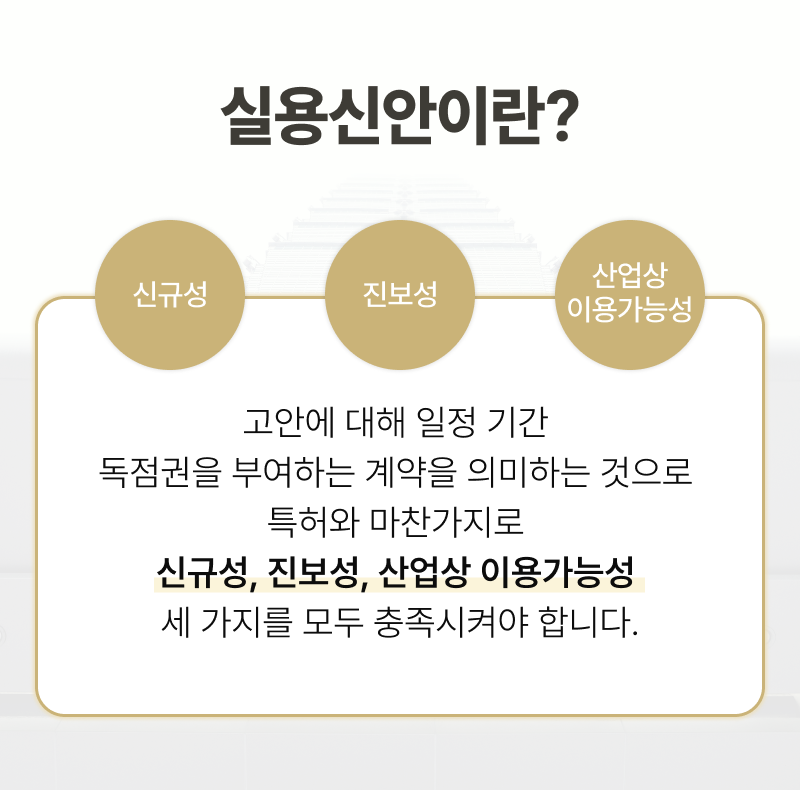 고안에 대해 일정 기간 독점권을 부여하는 계약을 의미하는 것으로 특허와 마찬가지로 신규성, 진보성, 산업상 이용가능성 이 세 가지를 모두 충족시켜야 합니다.