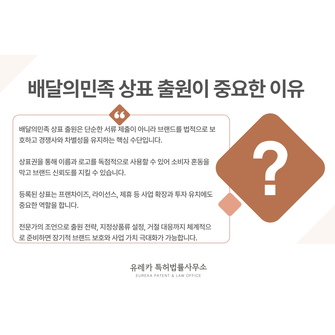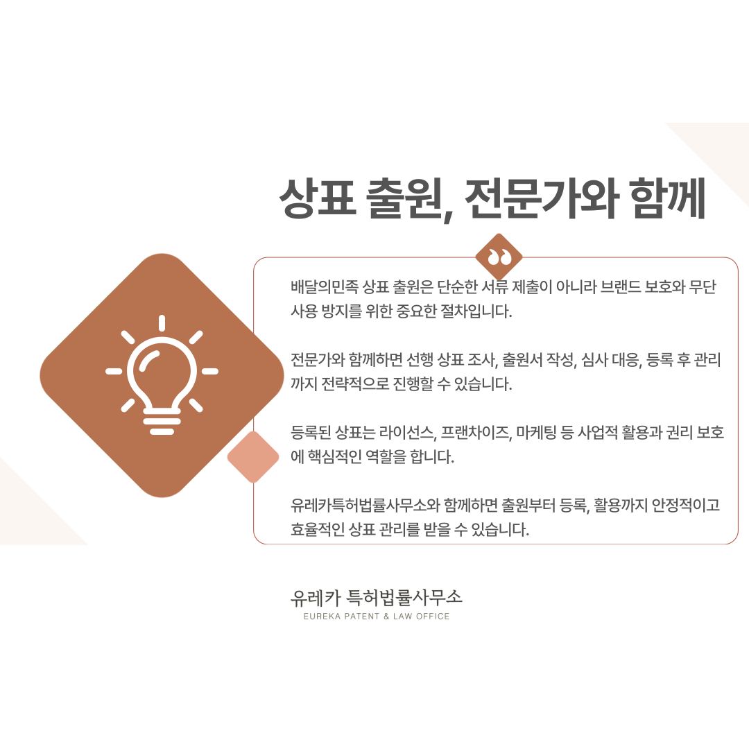 #배달의민족 #브랜드보호 #상표권 #상표전략 #지식재산권 #상표관리 #등록절차 #전문가상표출원 #TrademarkRegistration #TrademarkApplication #상표 #상표권 #상표출원 #상표등록 #유레카특허법률사무소