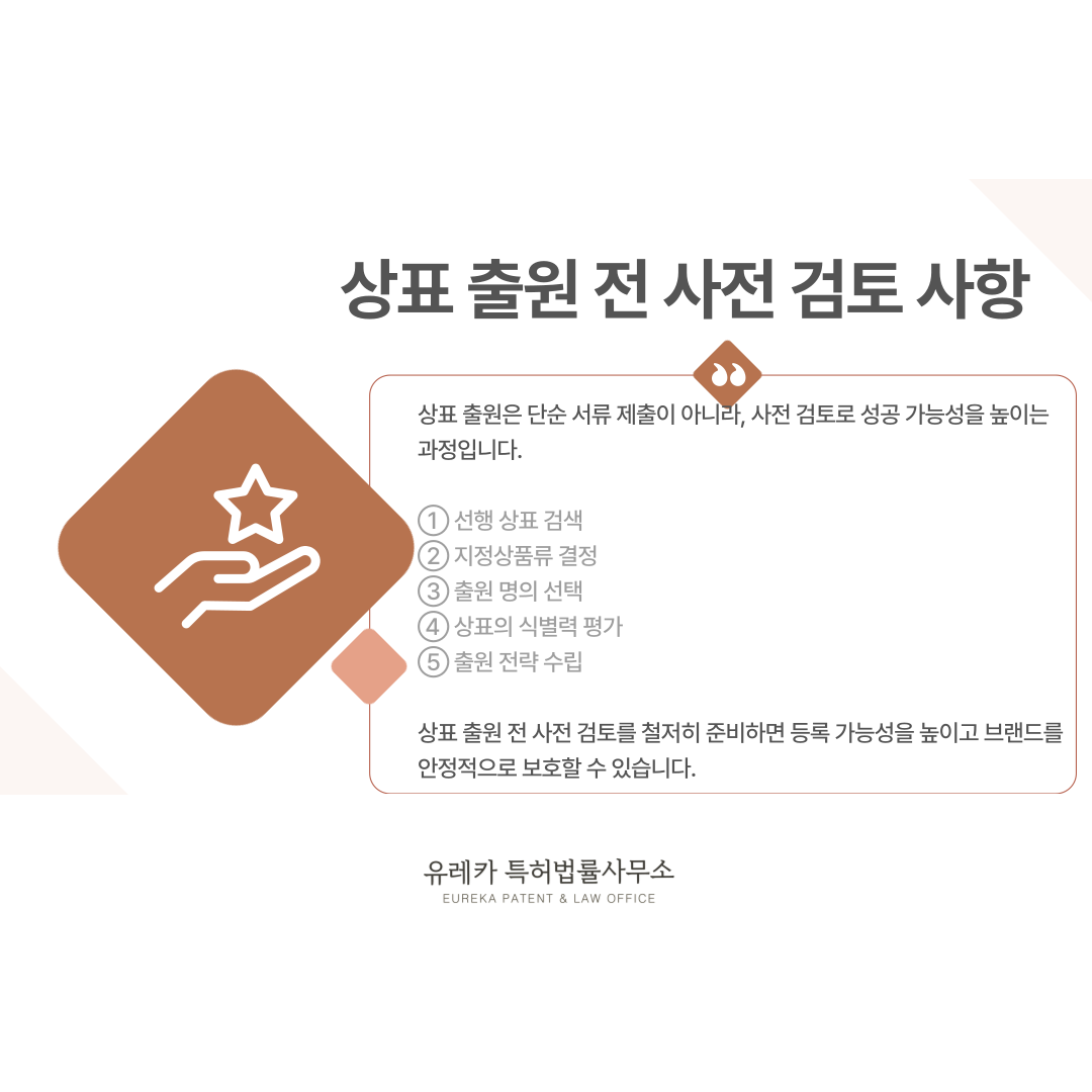 결론적으로, 상표 출원 전 사전 검토는 선행 상표 검색 → 지정상품류 결정 → 출원 명의 선택 → 식별력 평가 → 출원 전략 수립의 순서로 진행됩니다.