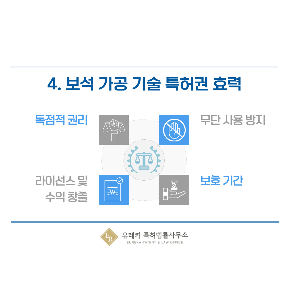 보석, 다이아몬드, 사파이어, 루비, 에메랄드, 진주 등의 세공·세팅·가공 기술이 특허로 등록되면 발명자는 해당 기술을 독점적으로 사용할 수 있는 권리를 가지게 됩니다.