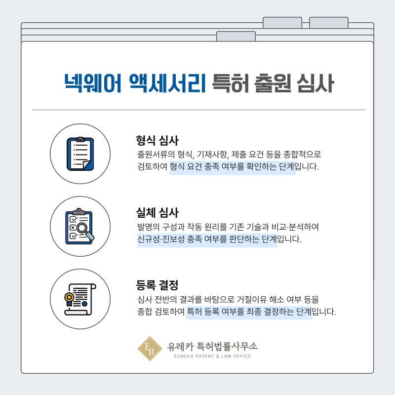 이 단계에서는 해당 액세서리 기술이 신규성, 진보성, 산업적 이용가능성을 충족하는지 종합적으로 판단합니다.