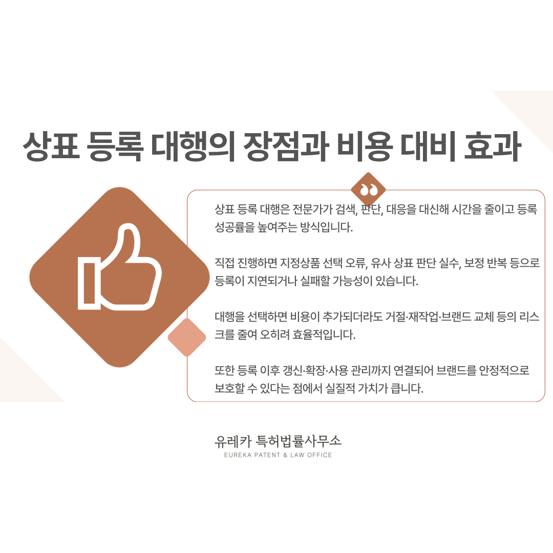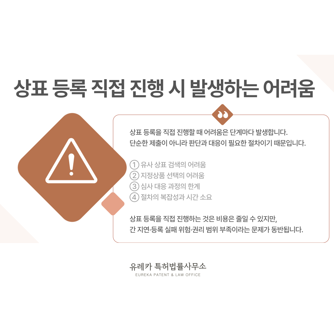 즉, 상표 등록을 직접 진행하는 것은 비용은 줄일 수 있지만, 시간 지연·등록 실패 위험·권리 범위 부족이라는 문제가 동반됩니다.