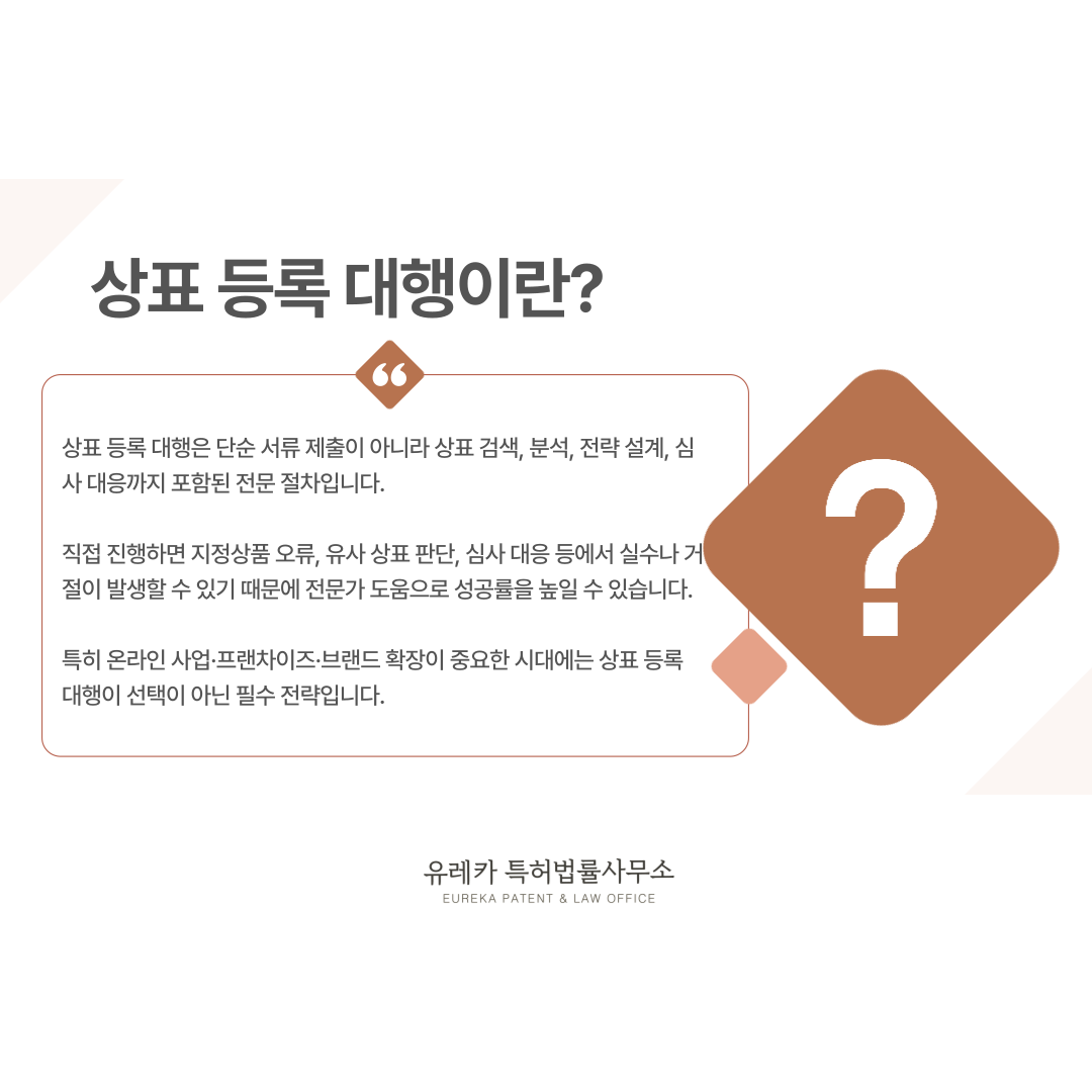 대행을 통해 처음부터 정확하게 진행하면 이러한 리스크를 줄이고, 브랜드 보호를 안정적으로 준비할 수 있습니다.