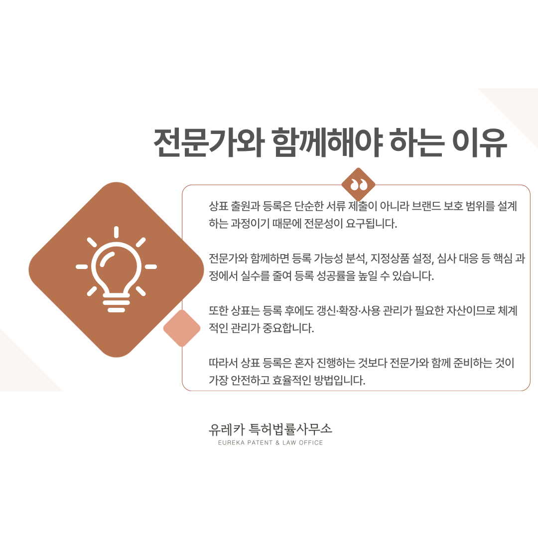 이 과정을 전문가와 함께하면 등록 성공률이 높아지고, 브랜드 보호가 더욱 안정적으로 진행될 수 있습니다.