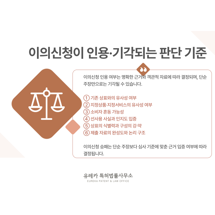 이의신청이 인용·기각되는 주요 판단 기준을 정확히 이해하고 준비하면, 상표 분쟁을 훨씬 유리하게 관리할 수 있습니다.