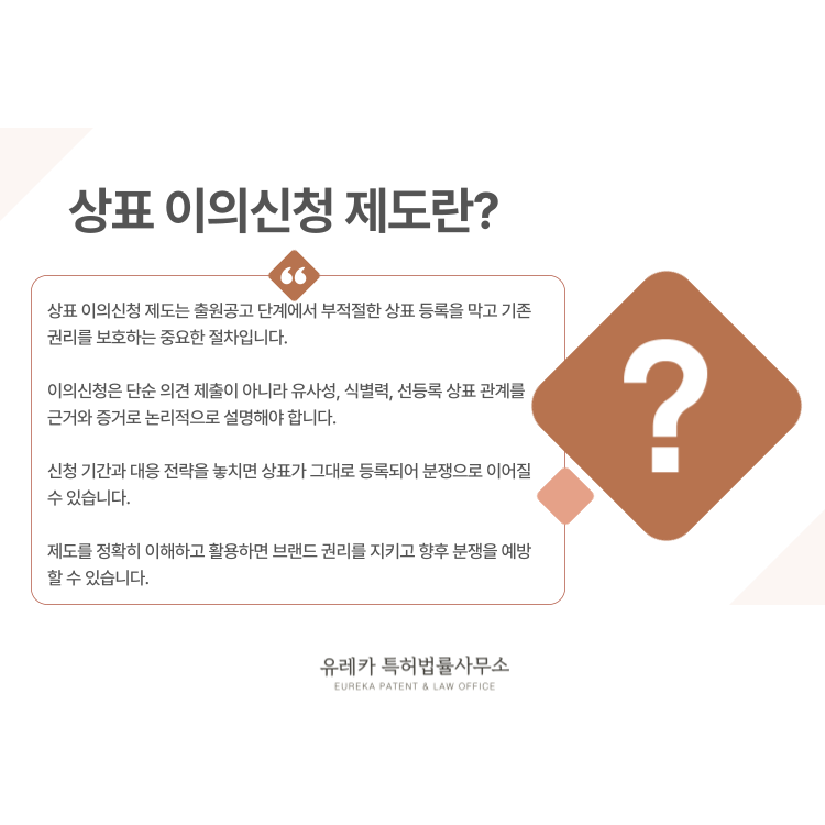 #상표이의신청 #상표분쟁 #상표출원공고 #상표권보호 #상표전략 #브랜드보호 #상표심사 #상표법 #지식재산권 #TrademarkRegistration #TrademarkApplication #상표 #상표권 #상표출원 #상표등록 #유레카특허법률사무소