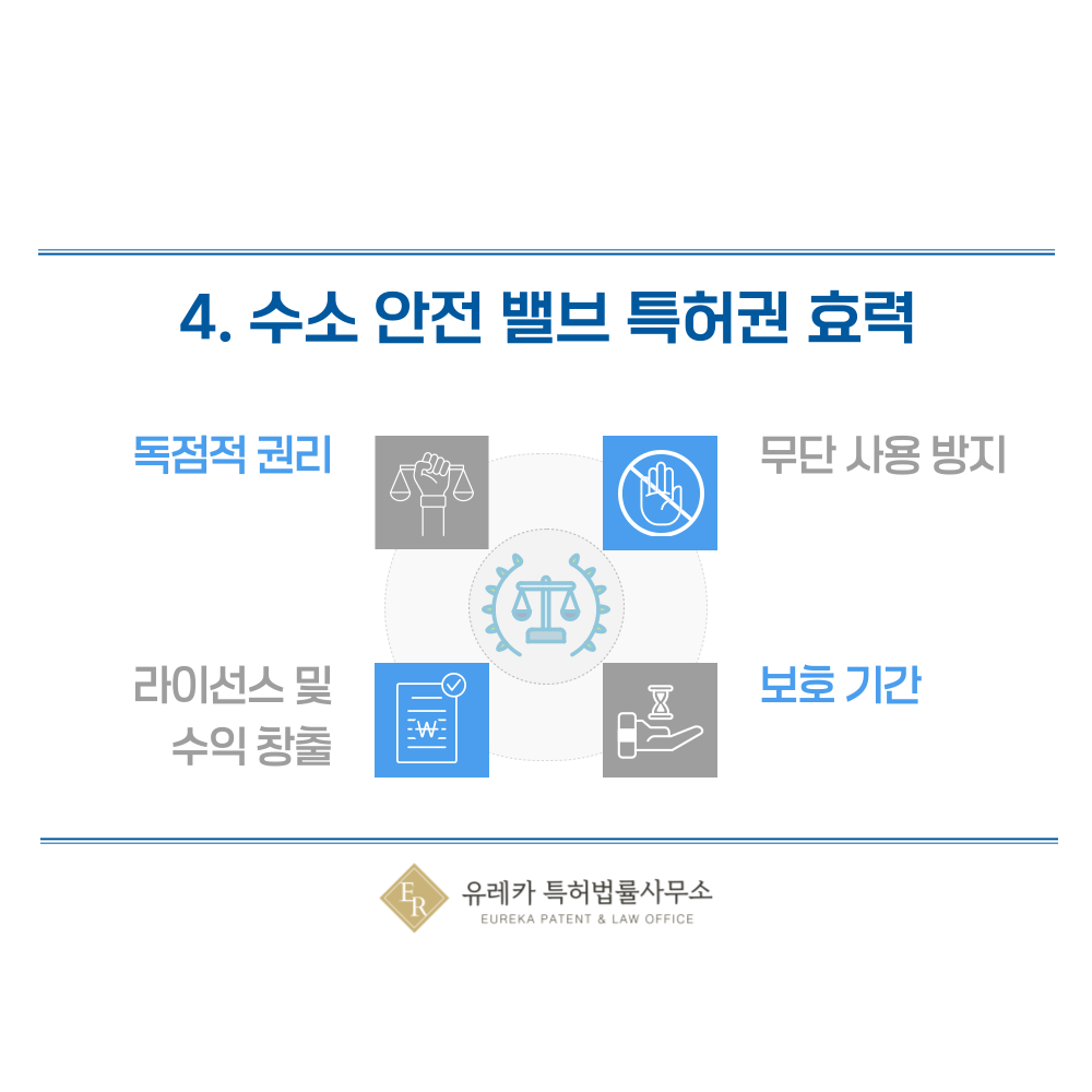 실체심사에서 모든 요건이 충족되면 특허 등록이 결정됩니다. 출원인은 정해진 기간 내에 등록료를 납부해야 하며, 납부가 완료되면 해당 기술은 정식으로 특허권이 부여됩니다. 등록 이후에는 수소 안전 밸브나 역류방지 장치 같은 기술을 독점적으로 활용할 수 있고, 타인이 무단으로 사용하는 경우 법적으로 대응할 수 있는 권리가 보장됩니다.