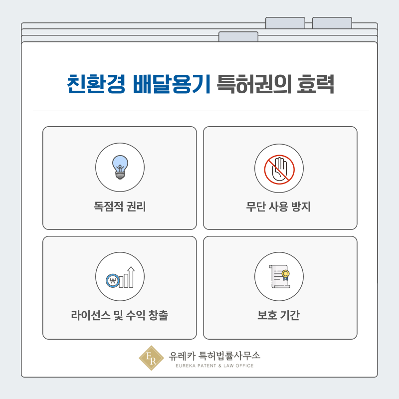 이때부터 해당 배달용기 기술은 법적으로 독점적 권리를 갖게 되며, 타인의 무단 사용을 제한할 수 있습니다.