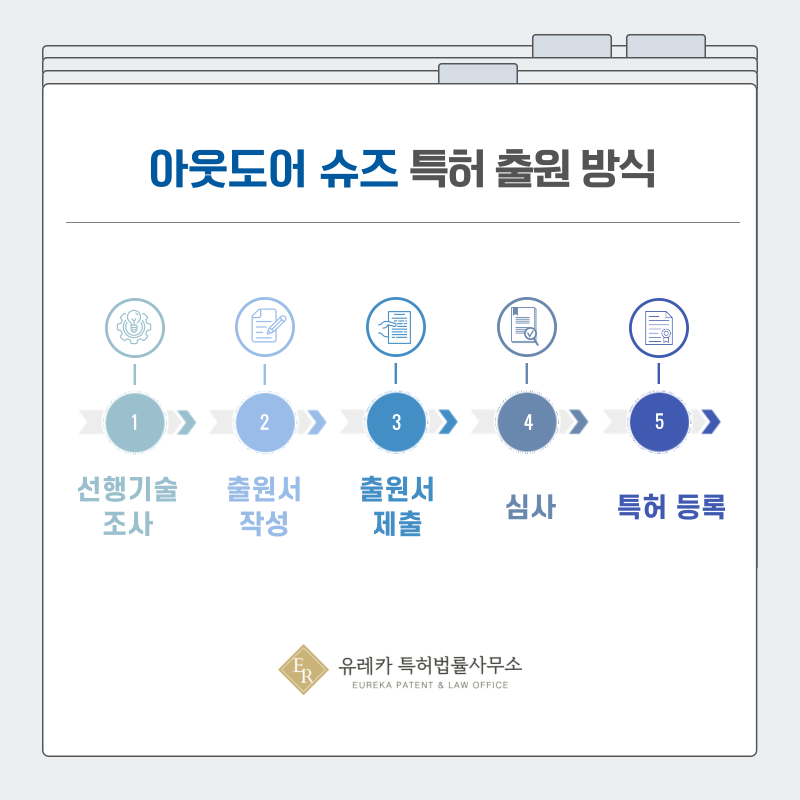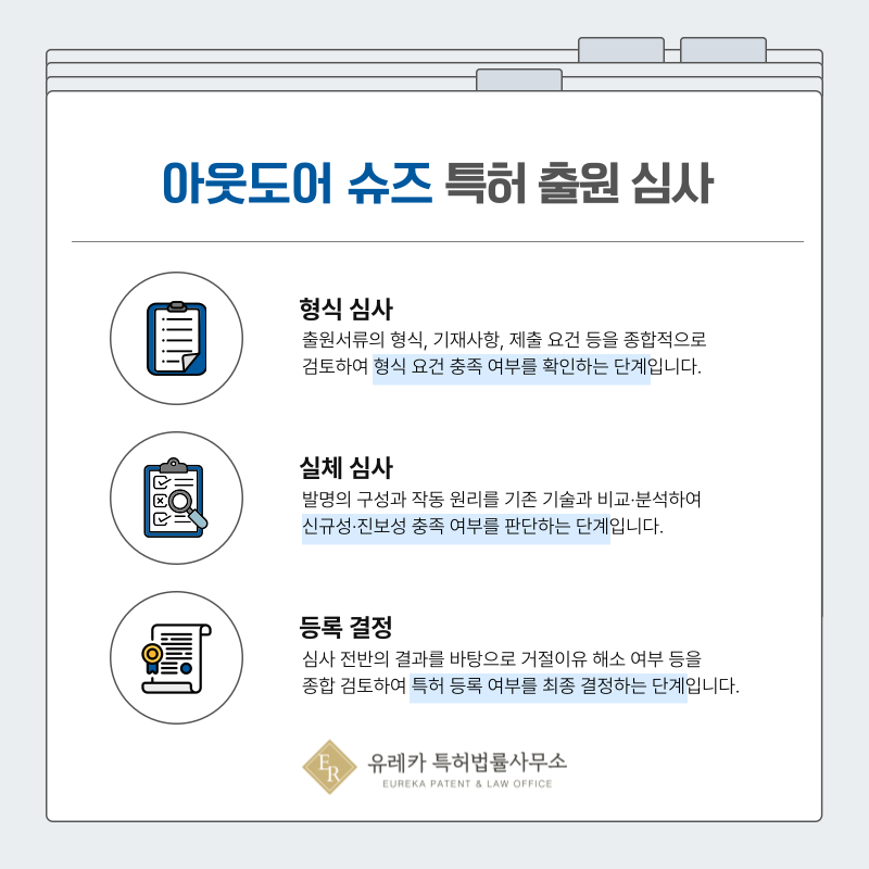 기존에 등록된 밑창 구조, 스트랩 방식, 쿠션 설계 등을 확인하지 않고 출원을 진행하면 신규성이나 진보성 부족으로 거절될 가능성이 높아집니다.