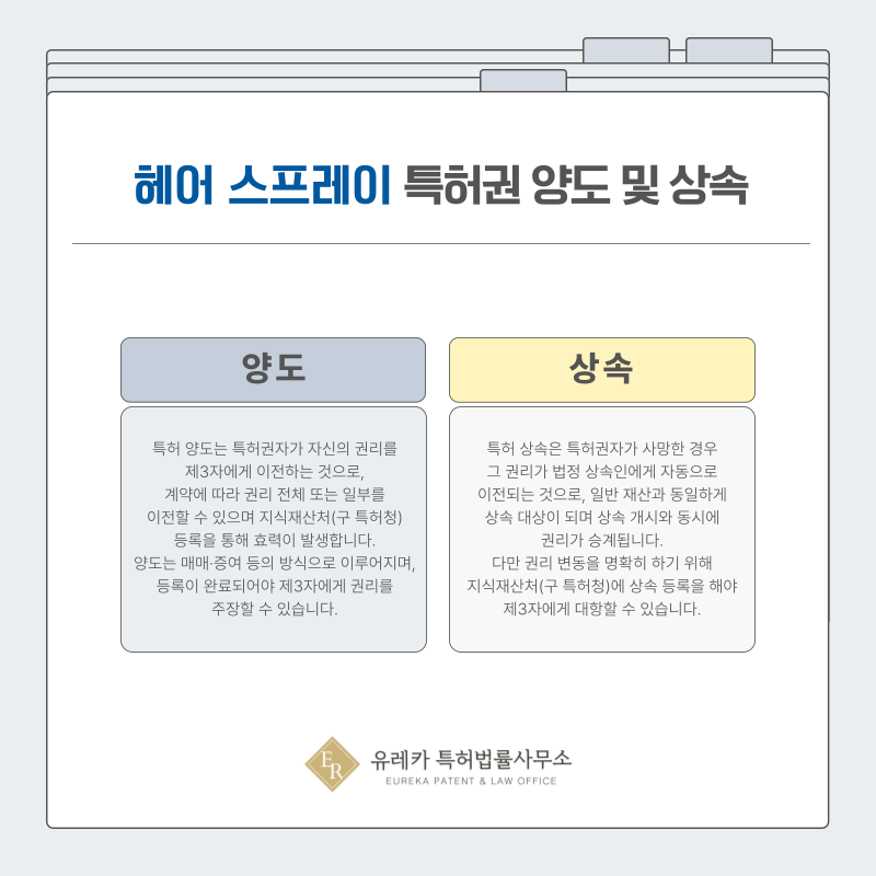 스프레이, 헤어 스타일링, 볼륨 고정, 픽서 관련 특허권은 재산권으로서 타인에게 양도할 수 있습니다.