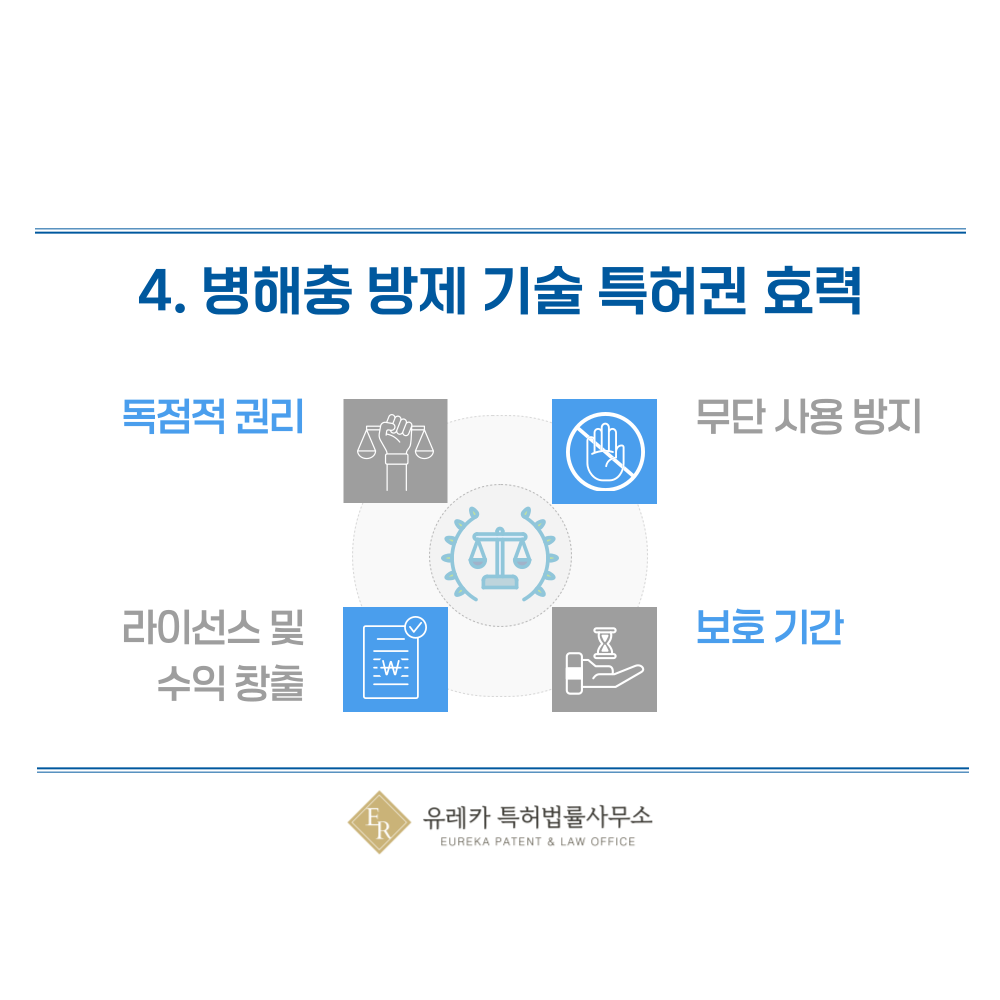 식물보호, 방제 기술, 농약, 트랩, 구제 장치와 같은 발명이 특허로 등록되면 권리자는 그 기술에 대해 독점적 권리를 갖게 됩니다.