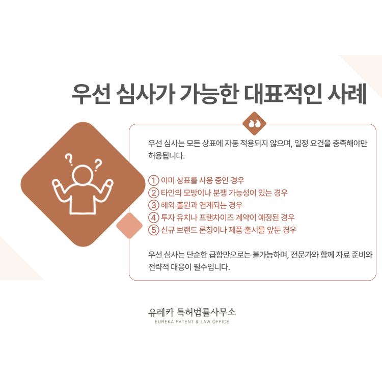 그래서 실제 사용 중이거나 사업 일정이 촉박한 경우에는 우선 심사를 통해 권리를 먼저 확보하는 전략이 중요합니다.