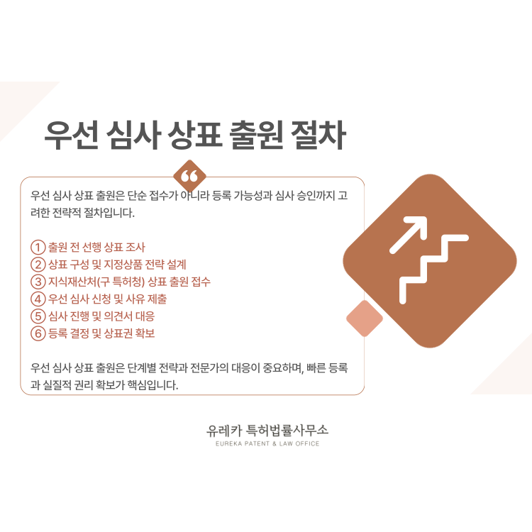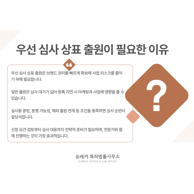 사업을 이미 시작했거나, 투자·프랜차이즈·해외 진출을 준비 중이라면 단순 출원보다 우선 심사를 검토하는 것이 훨씬 안전한 선택이 됩니다.