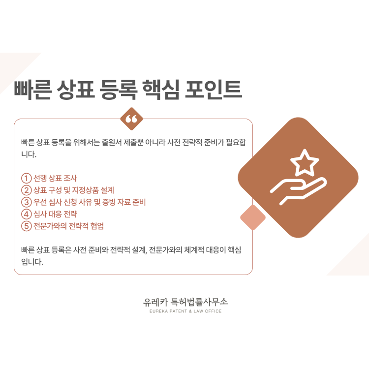 빠른 상표 등록은 단순히 절차를 빨리 진행하는 것이 아니라, 사전 준비와 전략적 설계, 체계적 심사 대응이 함께 이루어질 때 가능합니다.