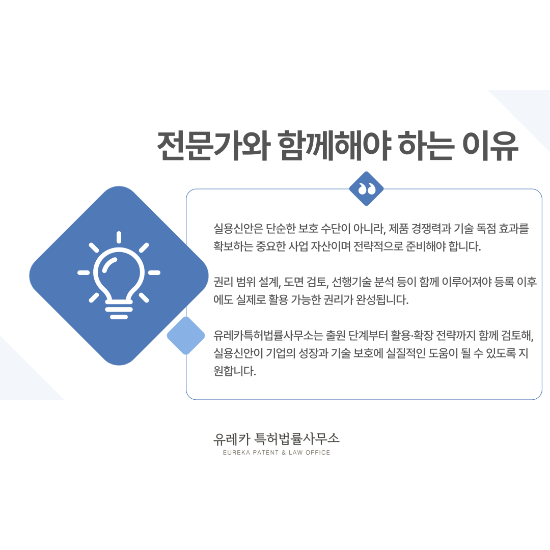 유레카특허법률사무소는 이러한 부분을 고려해 단순 출원이 아닌 ‘기술 보호 → 등록 → 활용 → 확장’까지 이어지는 실용신안 전략형 서비스를 제공합니다.