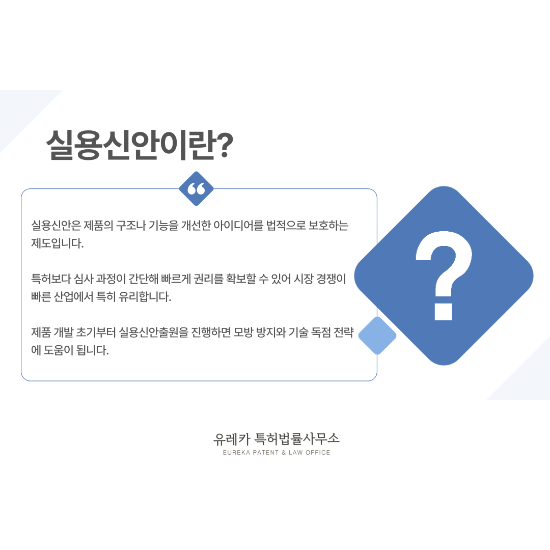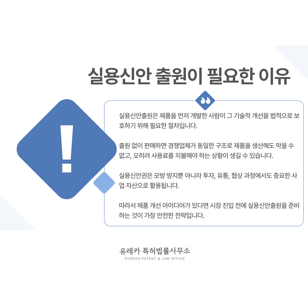 #실용신안출원 #실용신안등록 #지식재산권 #특허대리 #아이디어보호 #제품모방방지 #발명보호 #등록절차 #실용신안 #특허사무소 #기술보호 #출원준비 #심사대응 #권리확보 #PatentRegistration #PatentApplication #특허 #특허출원 #특허등록 #특허권 #유레카특허법률사무소