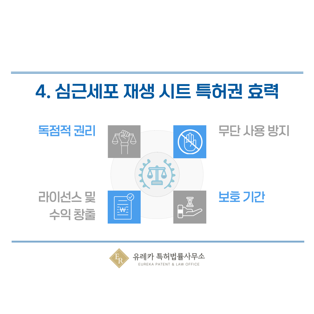 심근세포 기반 심장패치 기술이 특허로 등록되면 발명자는 해당 기술을 독점적으로 활용할 수 있는 권리를 갖게 됩니다. 즉, 심근세포시트 제작 방법이나 전기자극을 활용한 심혈관재생 기술을 출원인의 동의 없이 다른 사람이 사용할 수 없으며, 이를 통해 안정적인 기술적 주도권을 확보할 수 있습니다.