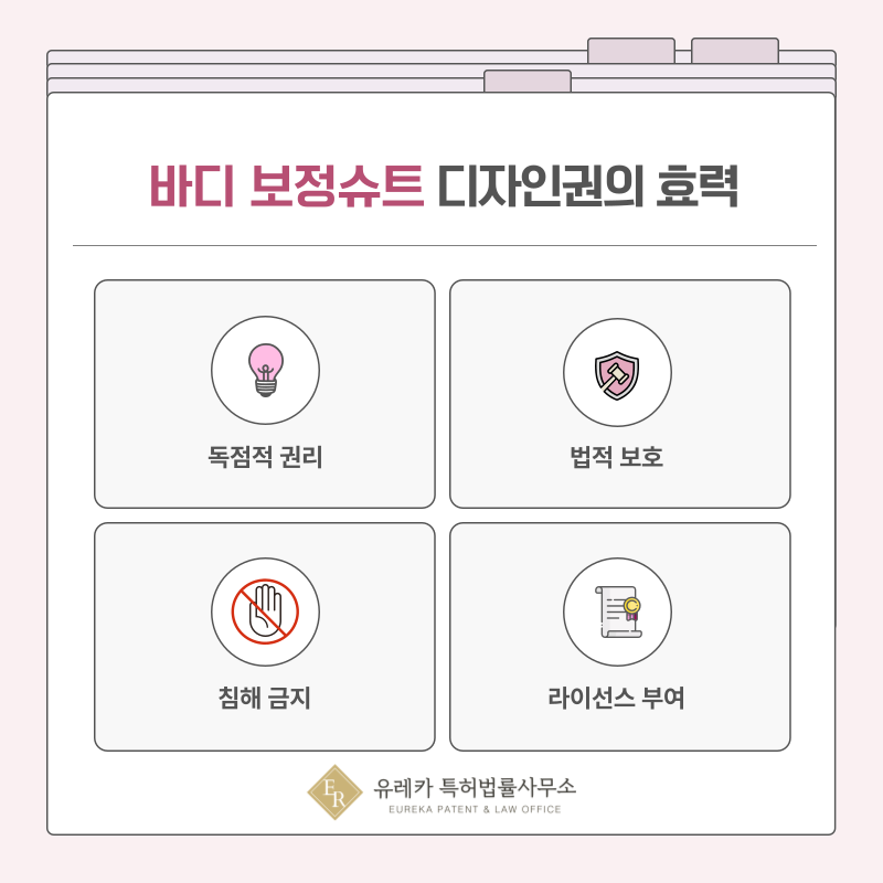 디자인권이 등록되면 해당 바디슈트나 보정 의류 디자인을 독점적으로 사용할 수 있는 권리가 발생합니다.