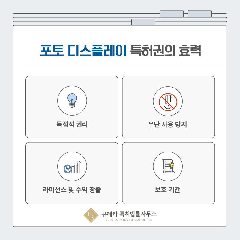 등록된 특허는 액자나 포토 디스플레이 기술에 대해 독점적 권리를 부여받게 되며, 타인의 무단 사용을 제한할 수 있습니다.