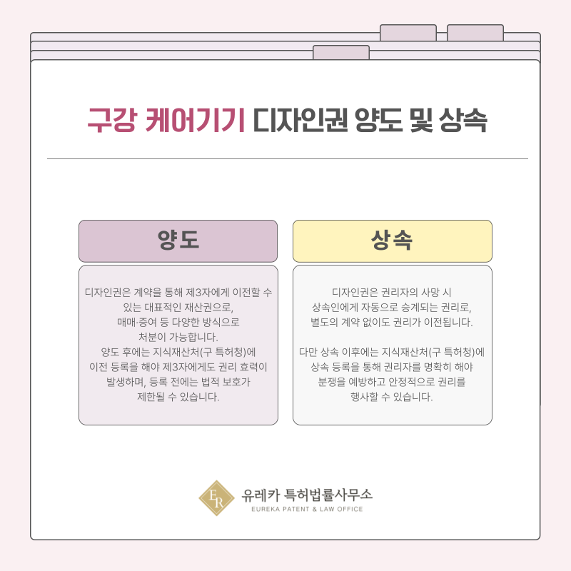 오랄 케어 기기나 구강 관리 디바이스 디자인권은 재산권이기 때문에 다른 사람이나 기업에게 자유롭게 양도할 수 있습니다.