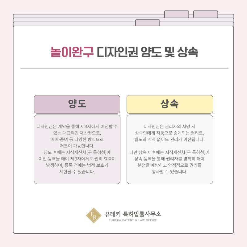 즉 완구나 교구 관련 등록 디자인권도 다른 자산과 함께 상속인에게 승계될 수 있습니다.