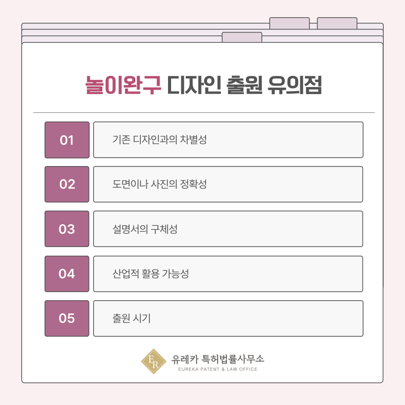 완구, 장난감, 놀이용품, 교구, 피규어 디자인 출원에서는 기존 디자인과 차별성이 분명해야 등록 가능성을 높일 수 있습니다.