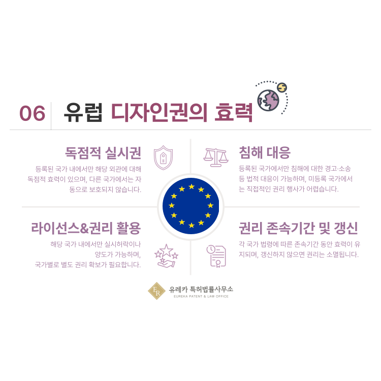 권리를 유지하면 유럽 시장에서 독점적으로 디자인을 활용하고, 침해 발생 시 법적 대응이 가능합니다.