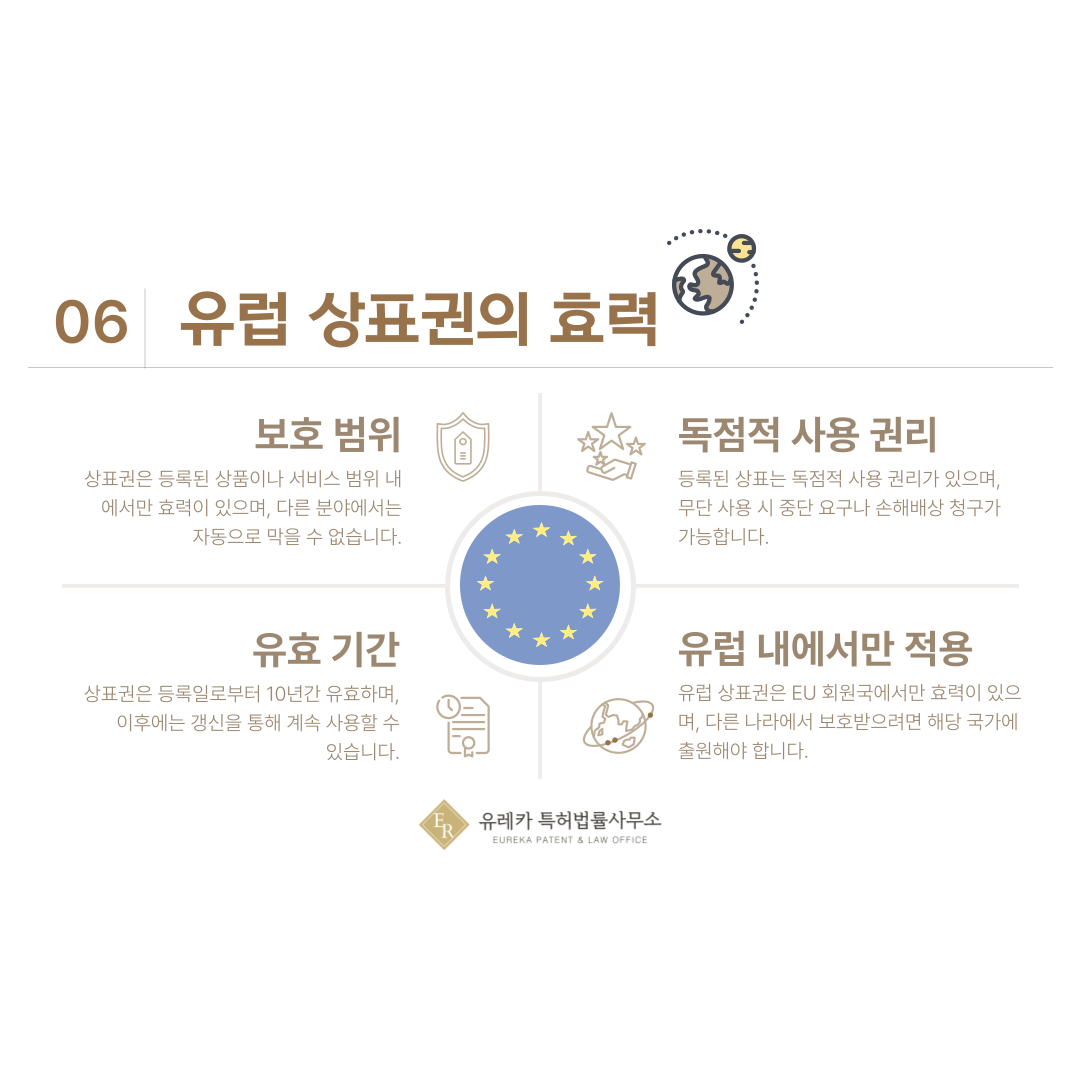 유럽 상표권은 EU 회원국에서만 효력이 인정되며, EU 외 국가에서는 자동 보호가 이루어지지 않습니다.
