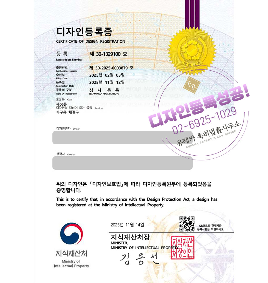 유레카 디자인등록성공ㅣ고정구, 꺾쇠, 밀양 디자인 출원 “가구용 체결구” 디자인권 특허 등록