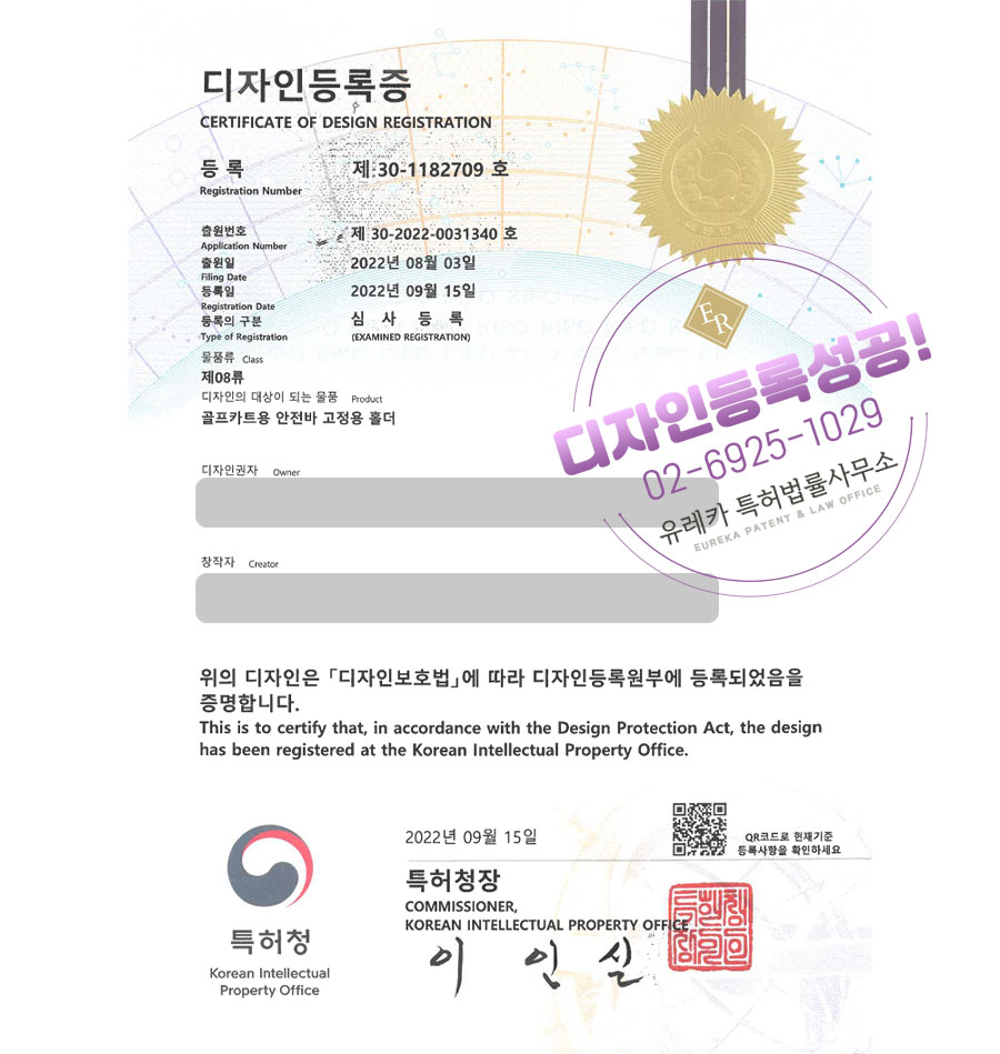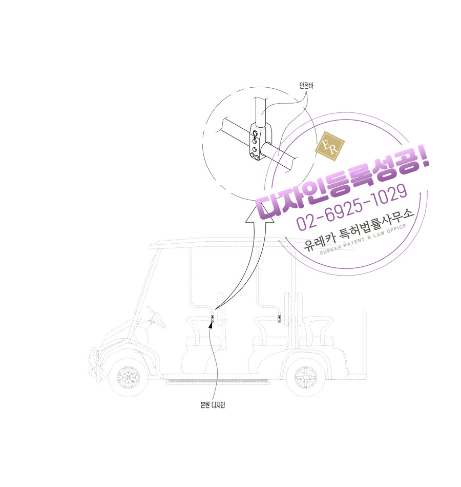 유레카 디자인등록성공ㅣ고정구, 커넥터, 안전용품 디자인 출원 “골프카트용 안전바 고정용 홀더” 디자인권 특허 등록
