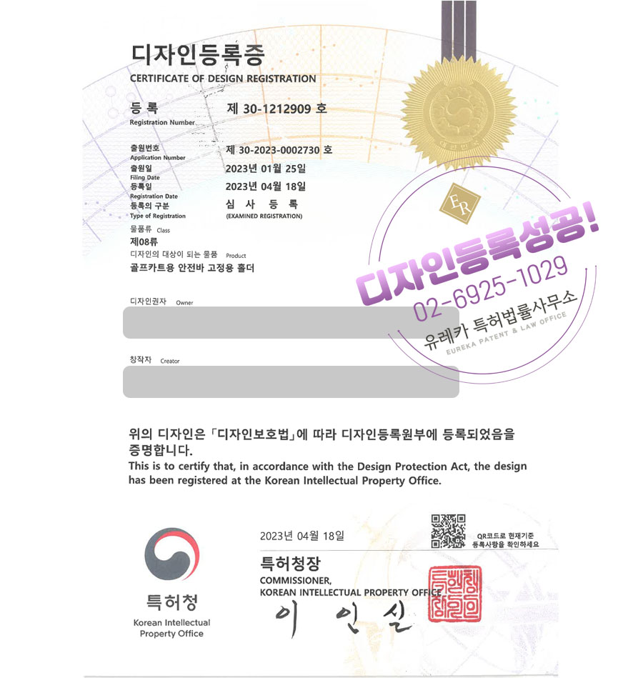 유레카 디자인등록성공ㅣ골프백, 골프채, 캐디용품 디자인 출원 “골프카트용 안전바 고정용 홀더” 디자인권 특허 등록