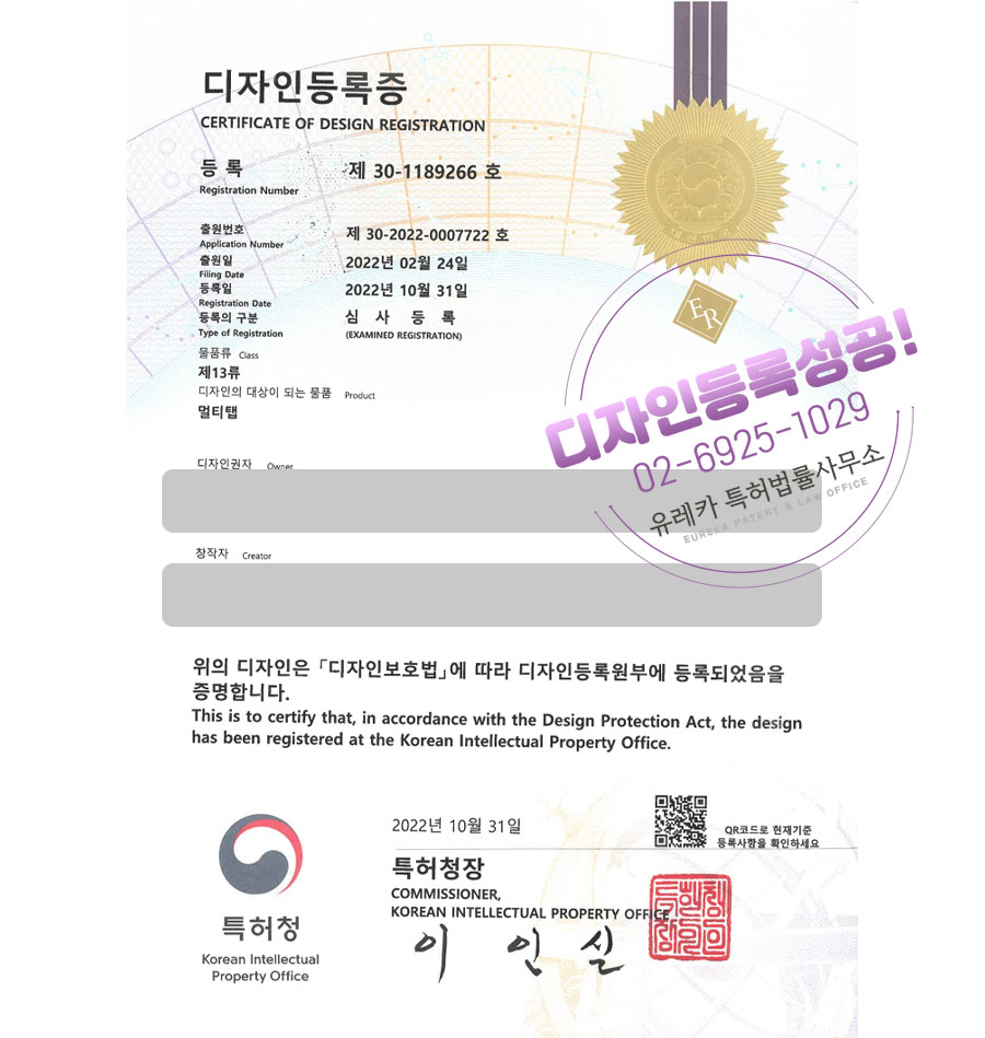 유레카 디자인등록성공ㅣ전기용품, 콘센트, 충청북도 디자인 출원 “멀티탭” 디자인권 특허 등록