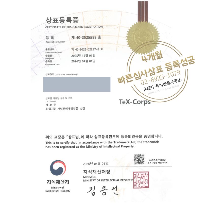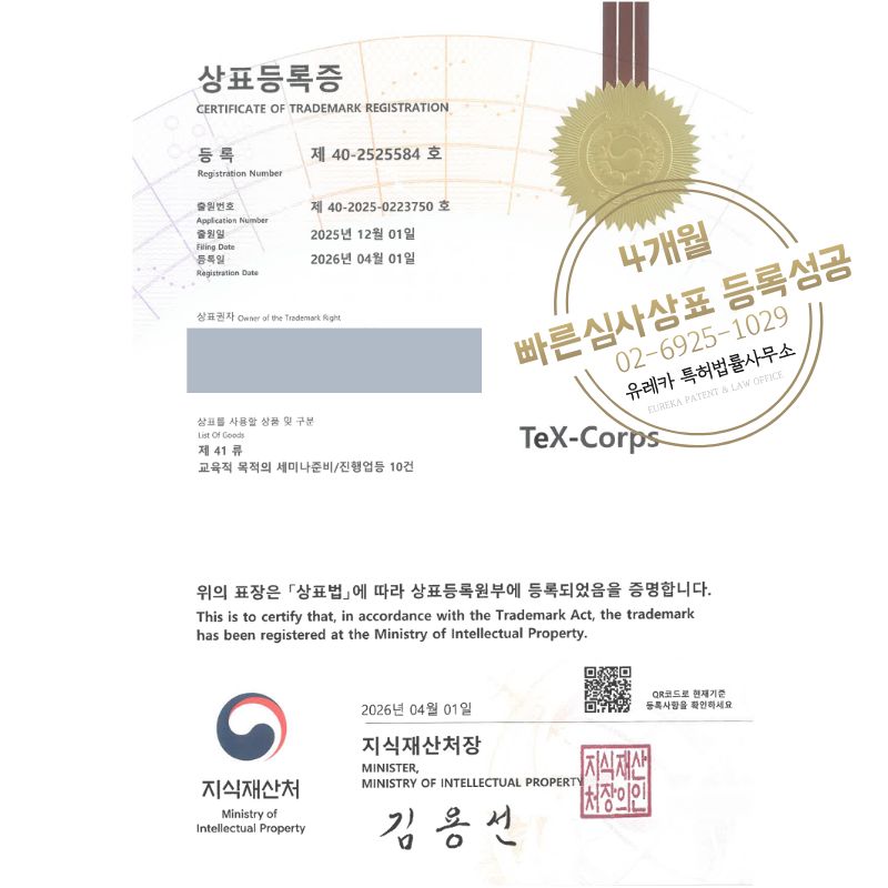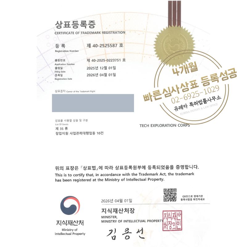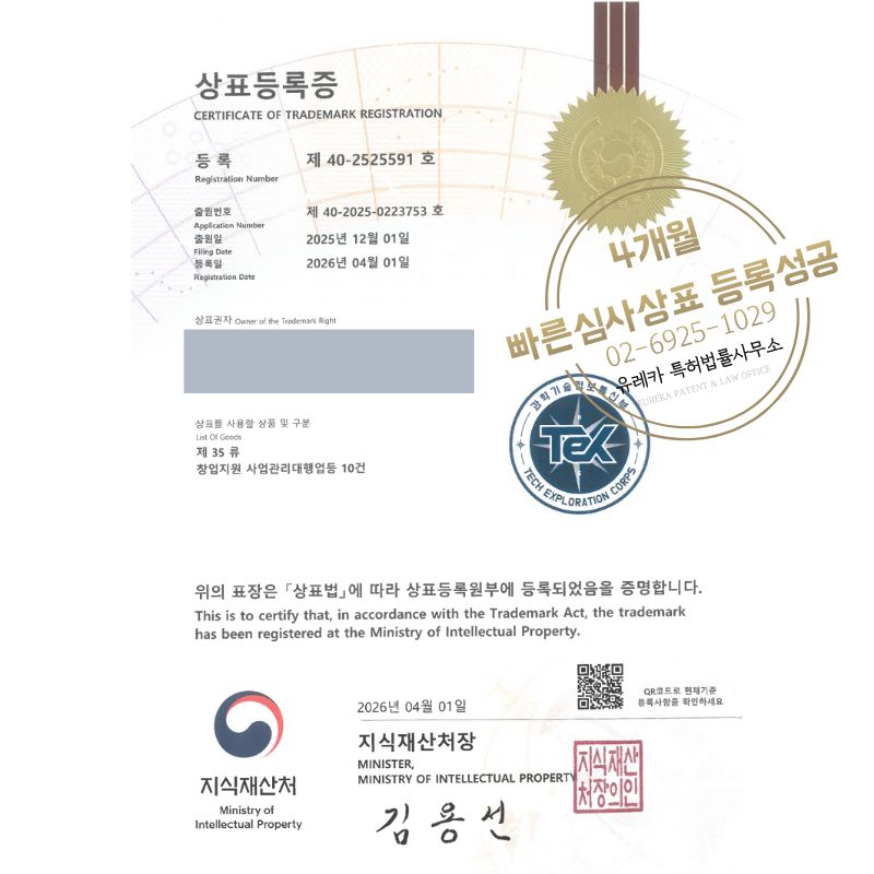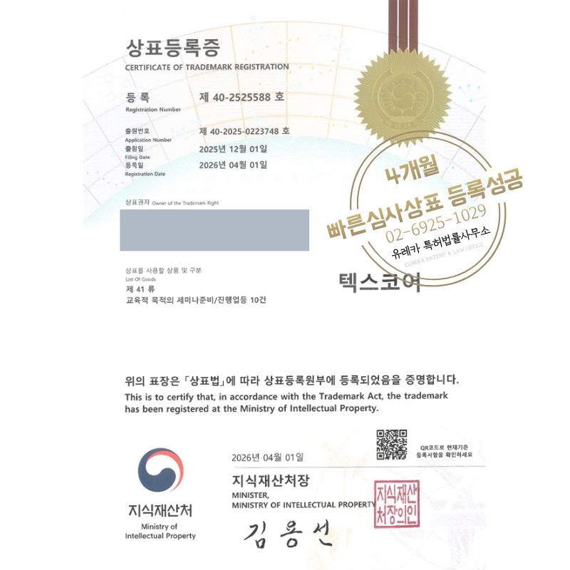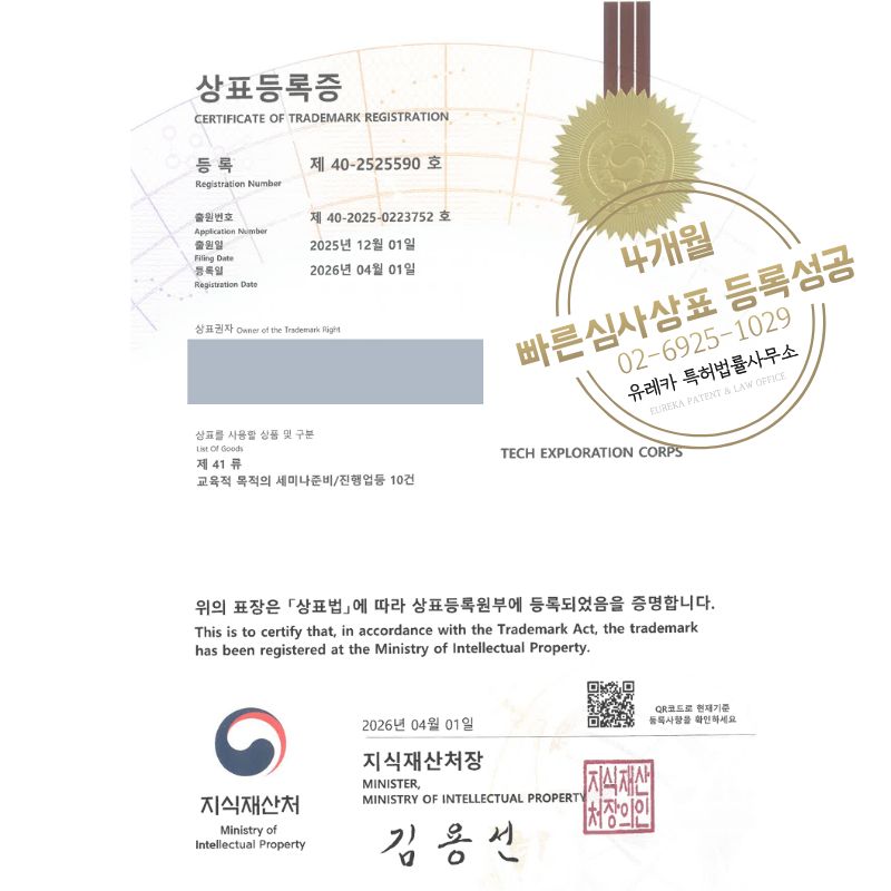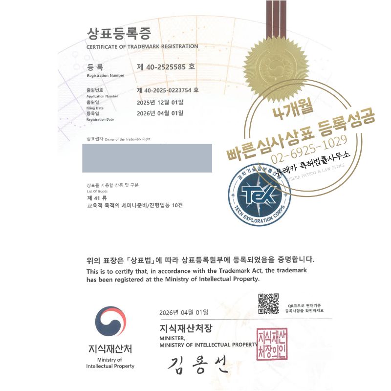 상표심사를 통과하여, 최종적으로 35, 41류 상표등록에 성공하였습니다!