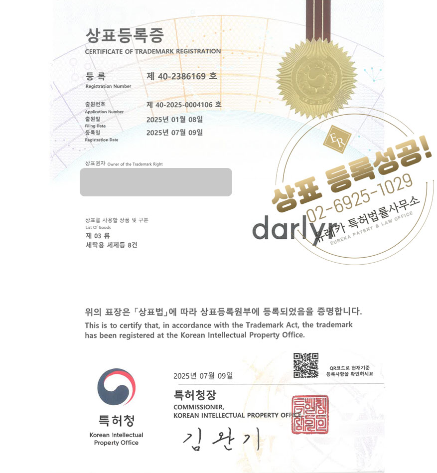 유레카 상표등록성공! 고양시 상표, 세탁세제, 섬유유연제 상표 특허 출원 “darlyr” 상표권 디자인 등록