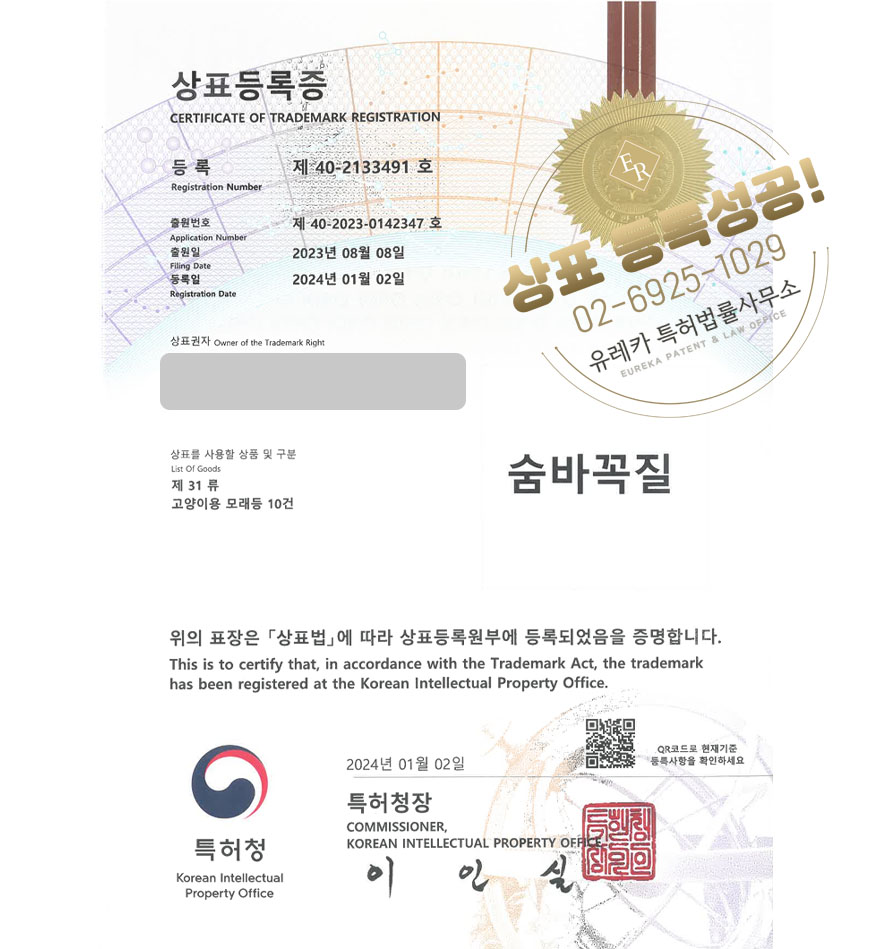유레카 상표등록성공! 고양이모래, 배변용품, 고양이사료 상표 특허 출원 “숨바꼭질” 상표권 디자인 등록