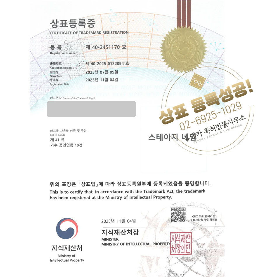 유레카 상표등록성공! 공연, 콘서트, 예매 플랫폼 상표 특허 출원 “스테이지 네임” 상표권 디자인 등록