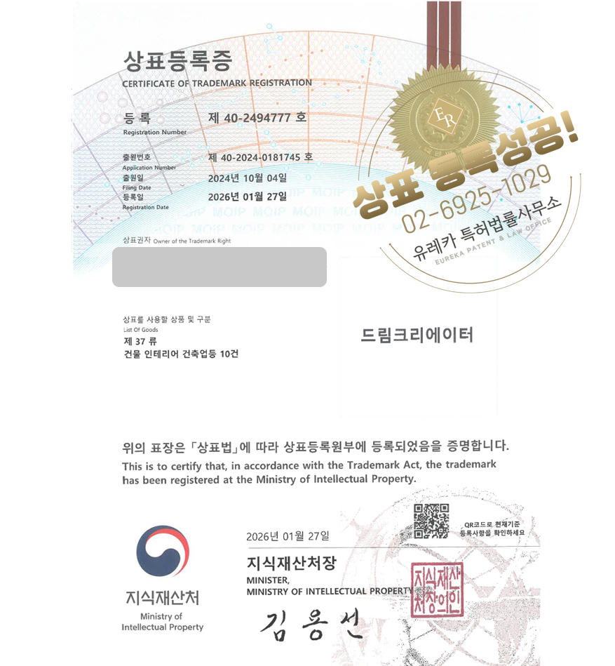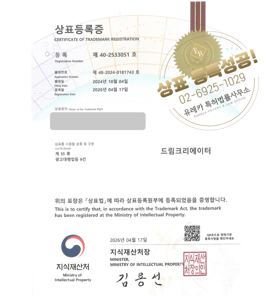 유레카 상표등록성공! 광고회사, 광고 대행업, 분양 광고 대행사, 유튜브 채널명, 부동산 광고채널 상표 특허 출원 “드림크리에이터” 상표권 디자인 등록