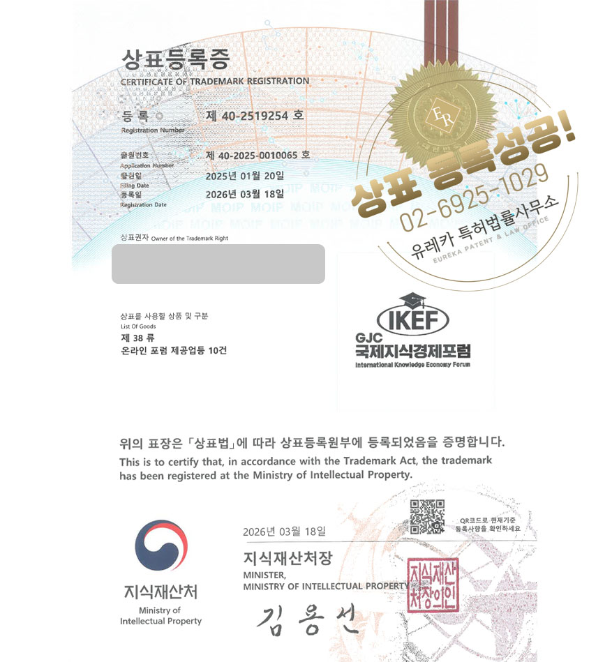유레카 상표등록성공! 국제행사, 컨퍼런스, 유튜브채널, 커뮤니티 상표 특허 출원 “IKEF GJC 국제지식경제포럼” 상표권 디자인 등록