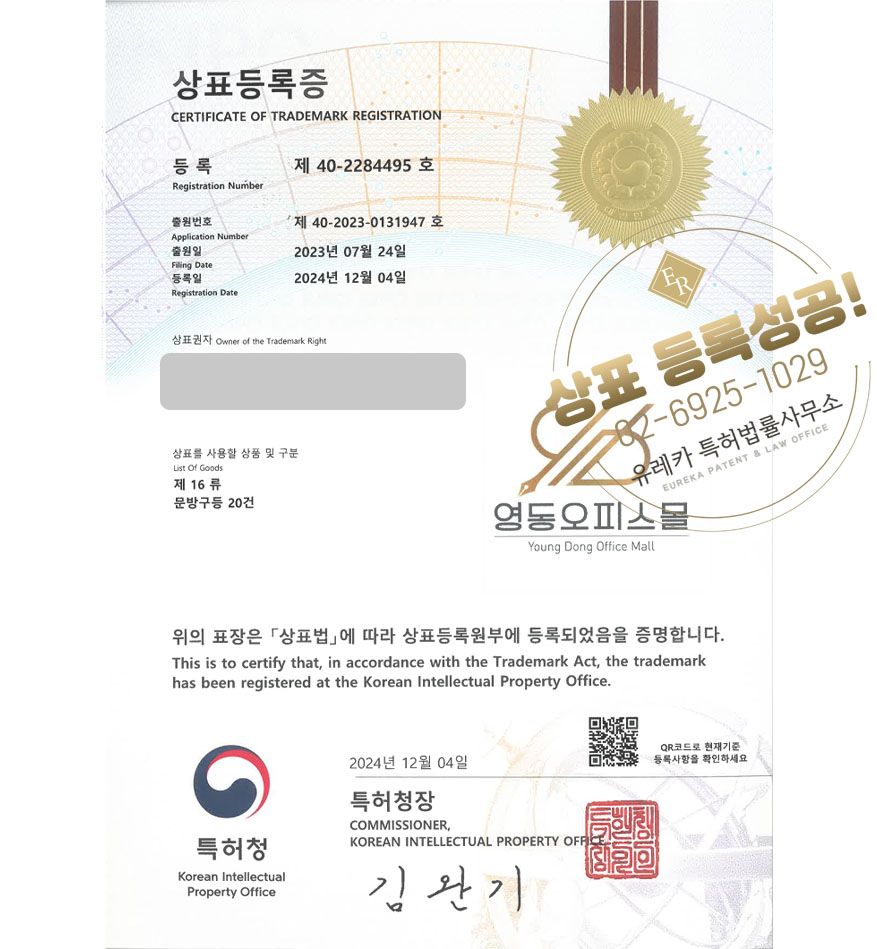 유레카 상표등록성공! 동해상표, 전산용품, 사무용품 전문몰 상표 특허 출원 “영동오피스몰” 상표권 디자인 등록