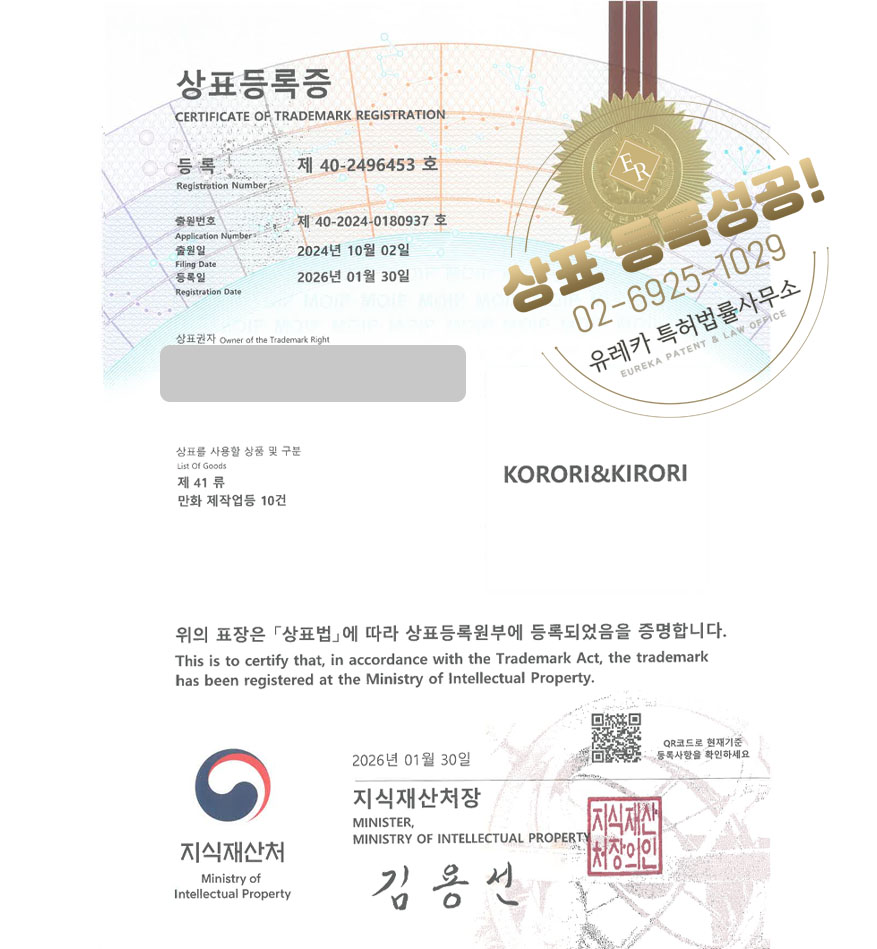 유레카 상표등록성공! 만화제작회사, 애니메이션스튜디오, 예능제작사 상표 특허 출원 “KORORI&KIRORI” 상표권 디자인 등록