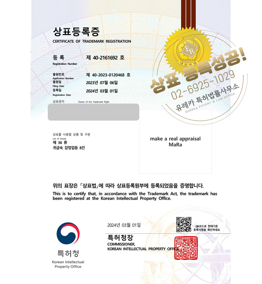 유레카 상표등록성공! 명품감정기관, 감정평가업체, 명품매입업체 상표 특허 출원 “make a real appraisal MaRa” 상표권 디자인 등록