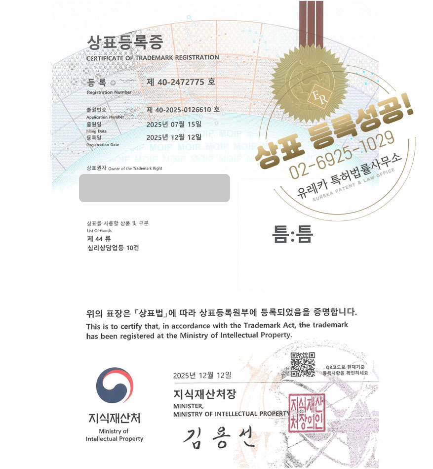 유레카 상표등록성공! 상담플랫폼, 오일테라피, 아로마샵 상표 특허 출원 “틈:틈” 상표권 디자인 등록