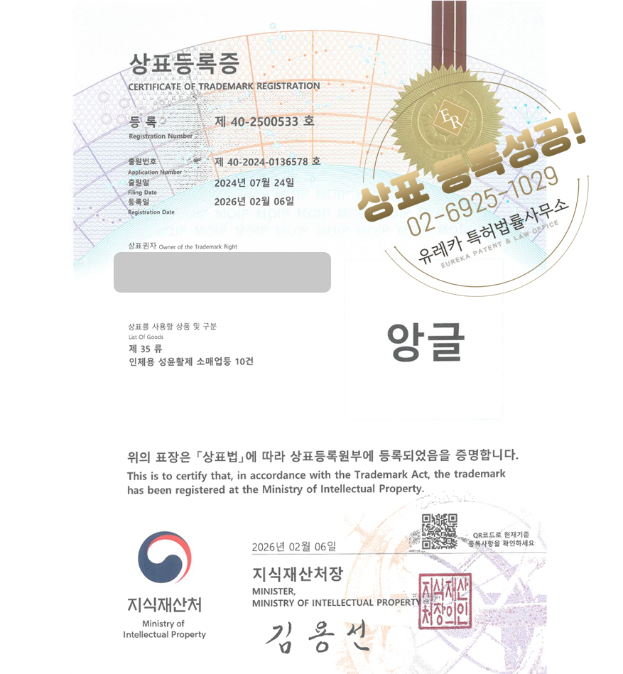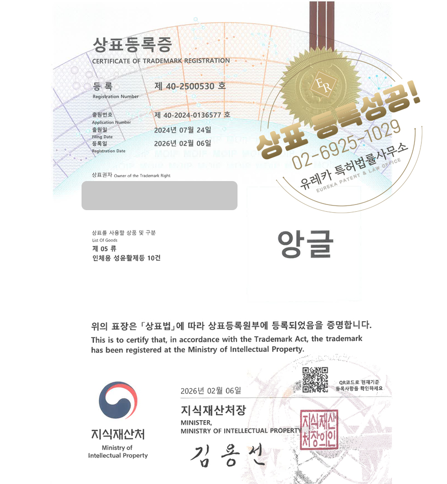 상표심사를 통과하여, 최종적으로 05, 35류 상표등록에 성공하였습니다!
