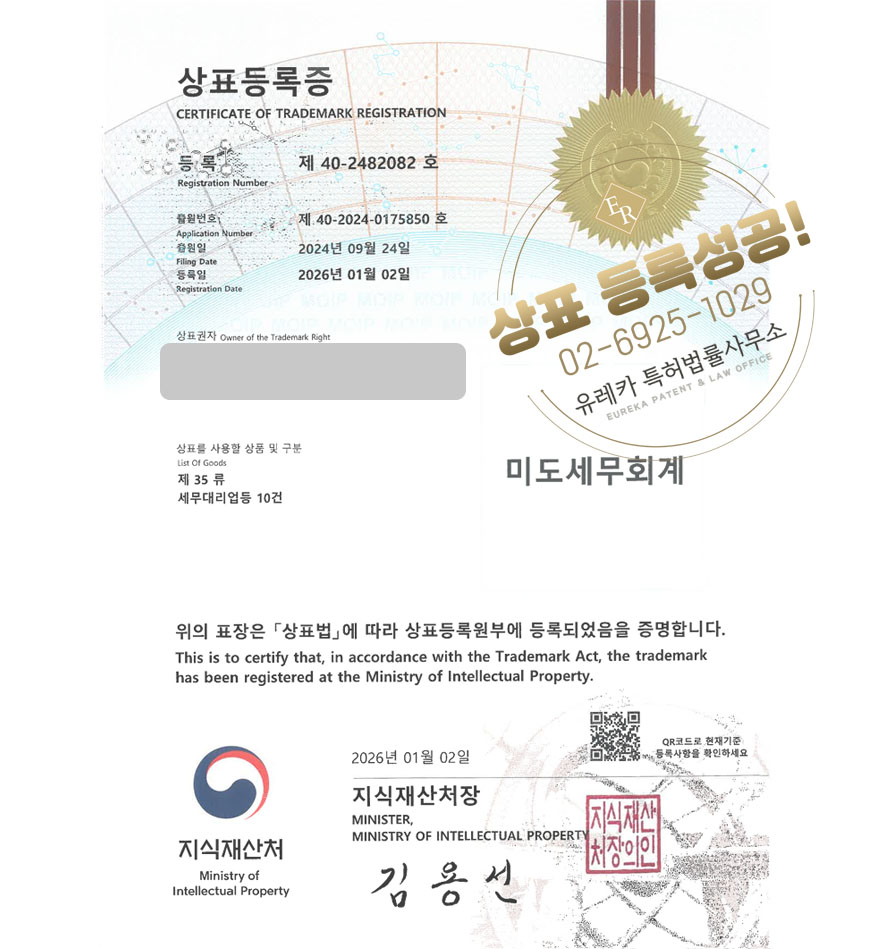 유레카 상표등록성공! 세무회계사무소, 기장업체, 노무법인 상표 특허 출원 “미도세무회계” 상표권 디자인 등록